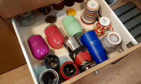 When organizing your caravan and choosing ideal locations for items like plates, utensils, and cups, a clever tip is to store your cups in a drawer. By designating a drawer for cups, you can arrange them for convenient access.