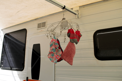 When in a caravan, make sure to explore every storage solution and use every bit of space available. Always look for opportunities to create a clothing area, like under the bed or on some shelves.
