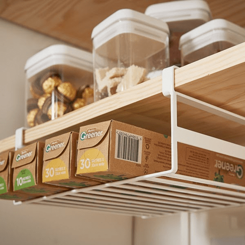 The excellent feature of these holders is their design, as they don’t occupy much space but still let you store multiple items inside. They are also very inexpensive and easy to find. Additionally, you can use them to store glass bottles in the kitchen or your kids’ snacks for convenient access.
